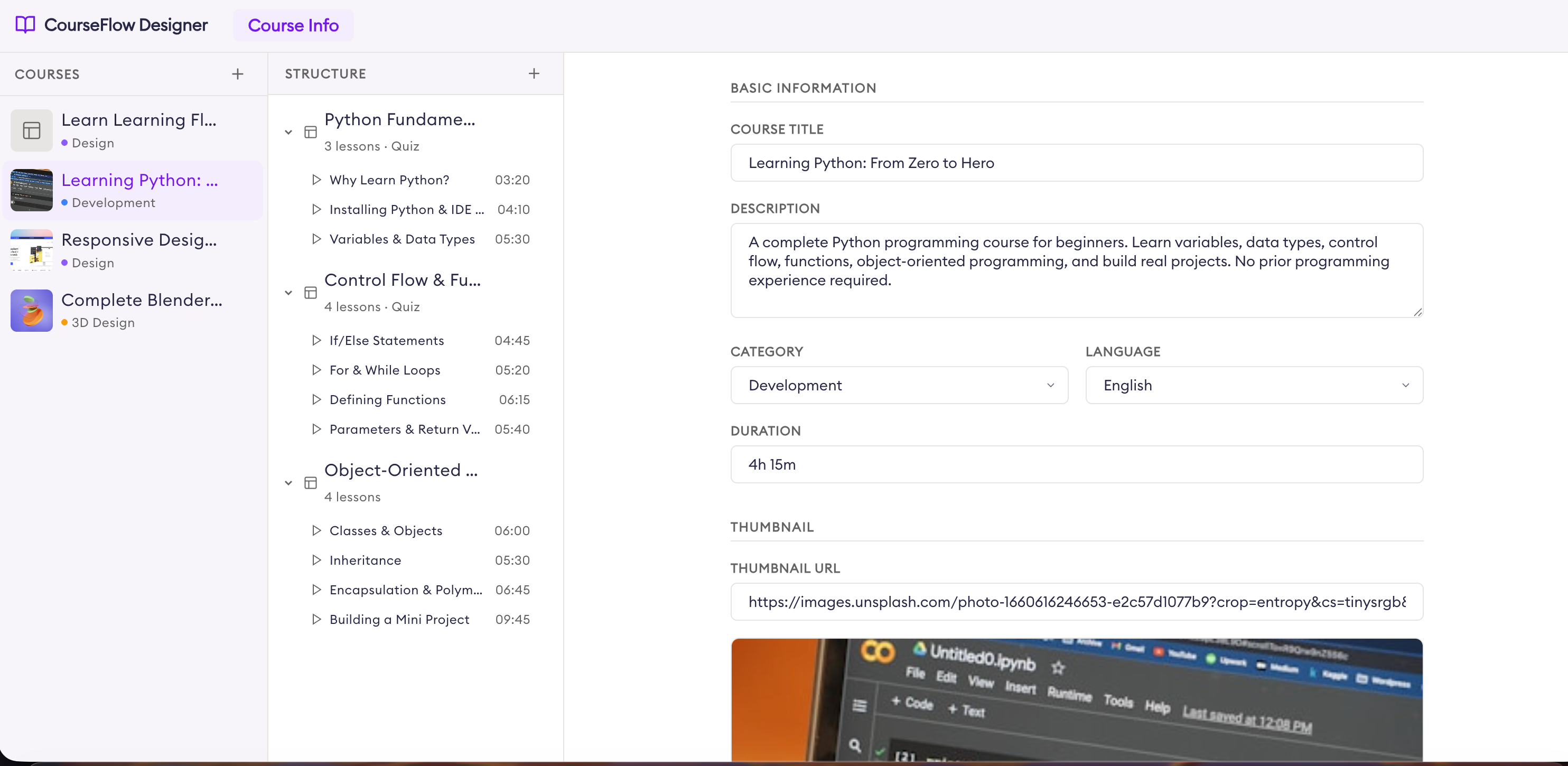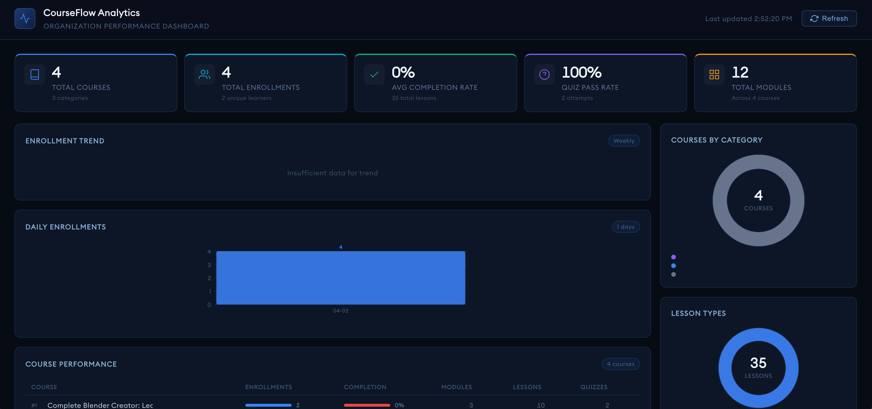 Deliver structured online courses with video lessons, quizzes, progress tracking, and an analytics dashboard — a complete learning platform for any team or audience.